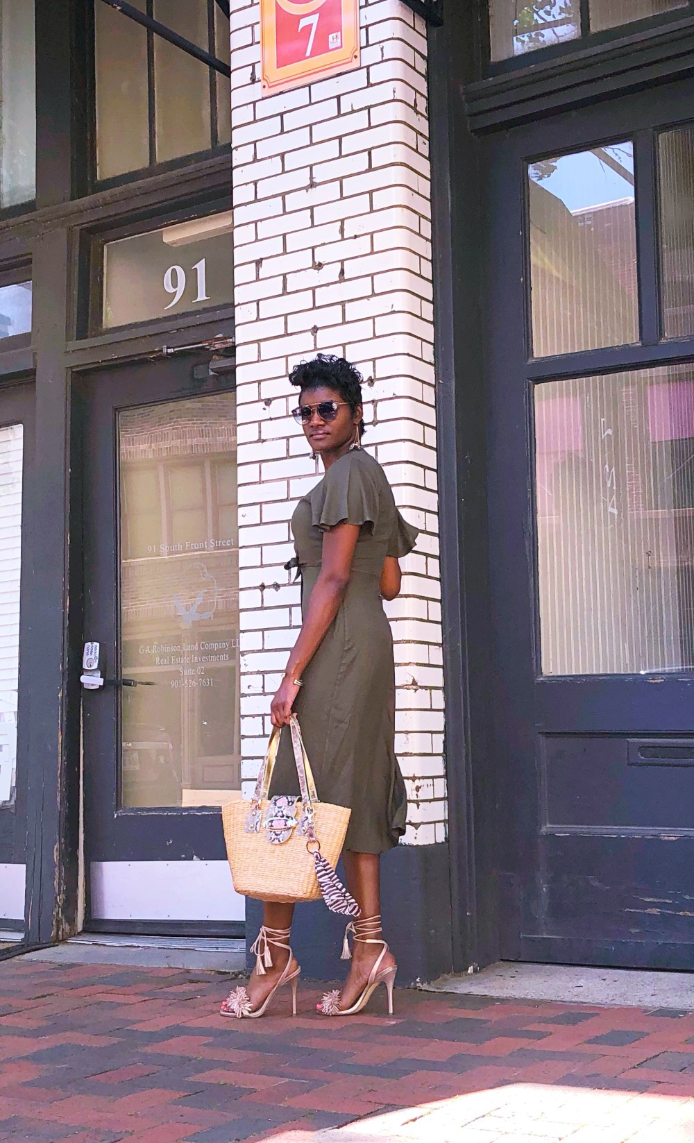 Wearing: Mimi Chica Tie-Front Dress (similar)| Ivanka Trump Women’s Hettie Dress Sandal | Guess Straw Handbag (old)